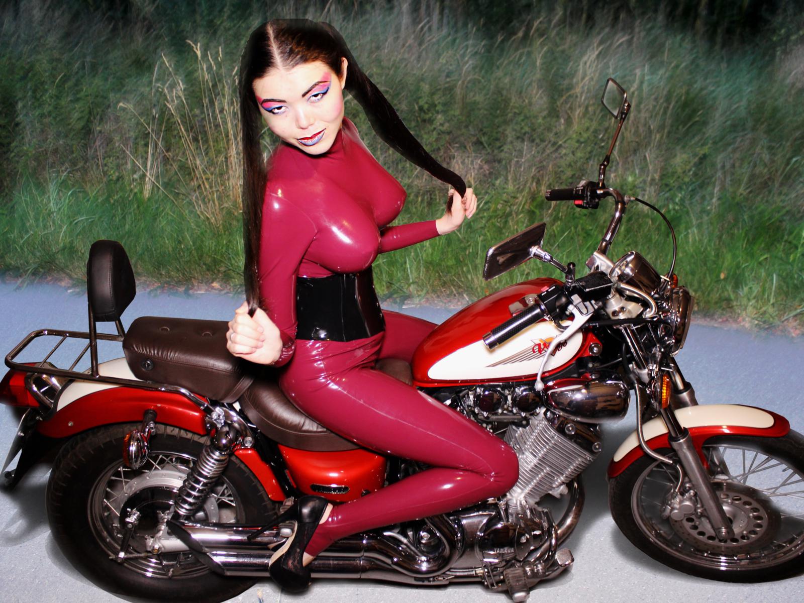 nelja, brunette, exotic, german, amateur, mistress, model, slim, busty, sexy babe, long hair, posing, smile, outdoor, tight clothes, red, latex, catsuit, fullsuit, black, underbust corset, high heels, shiny, rubber, fetish, nelja90, homemade
