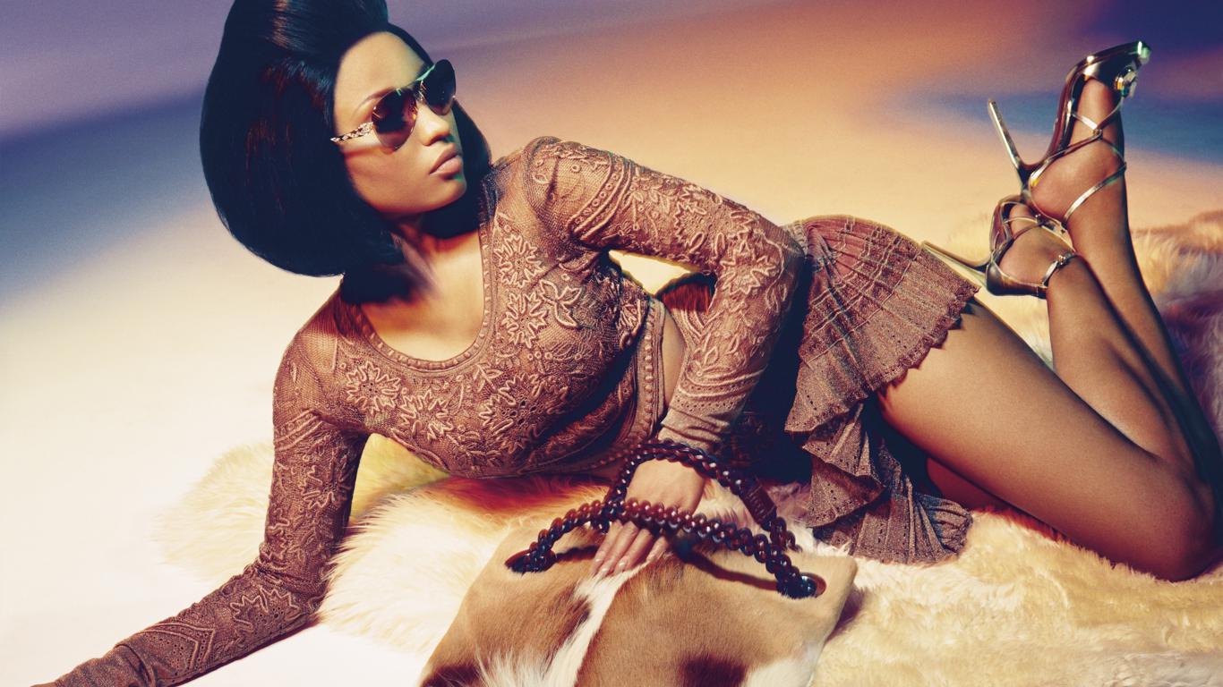 nicki minaj, american, exotic, singer, celebrity, brunette, ebony, sexy babe, long hair, posing, laying, pin up style, sexy dressed, hairstyle, sunglasses, lift legs, high heels, erotic, real celebs wall, ebony gold