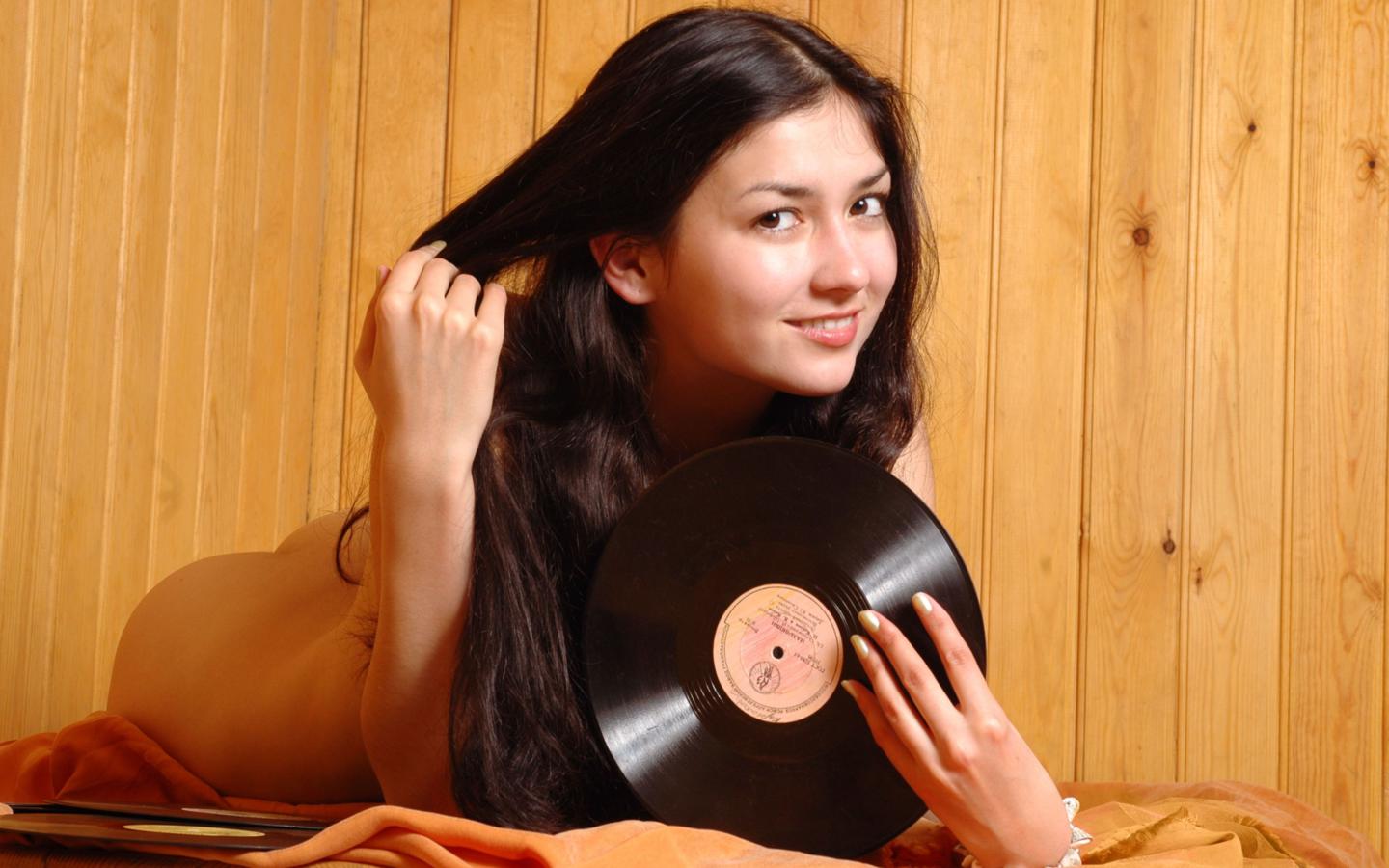 qualey, brunette, sexy girl, adult model, nude, naked, kazakh, vinyl records, smile, long hair, view, look, records, liya, bousya