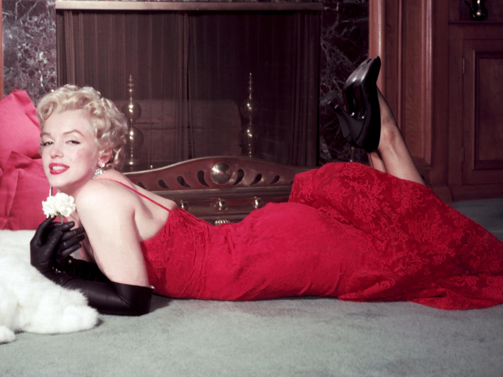 norma jean baker, aka, marilyn monroe, blonde, playmate, celebrity, hollywood, glamour, actress, diva, singer, sex symbol, sexy babe, curves, vintage, red, evening robe, opera gloves, high heels, erotic, real celebs wall