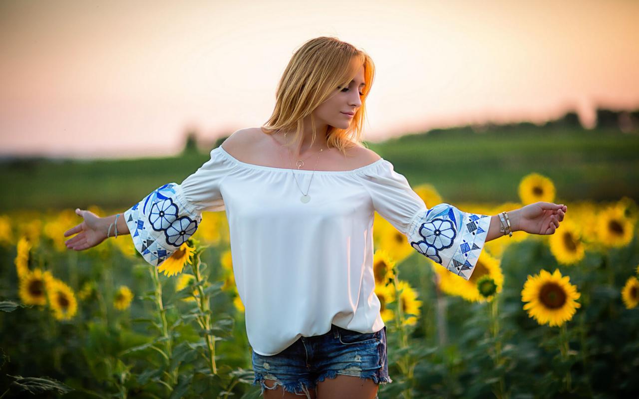girl, sexy, outdoors, shorts, blouse, field, sunflowers, erotic