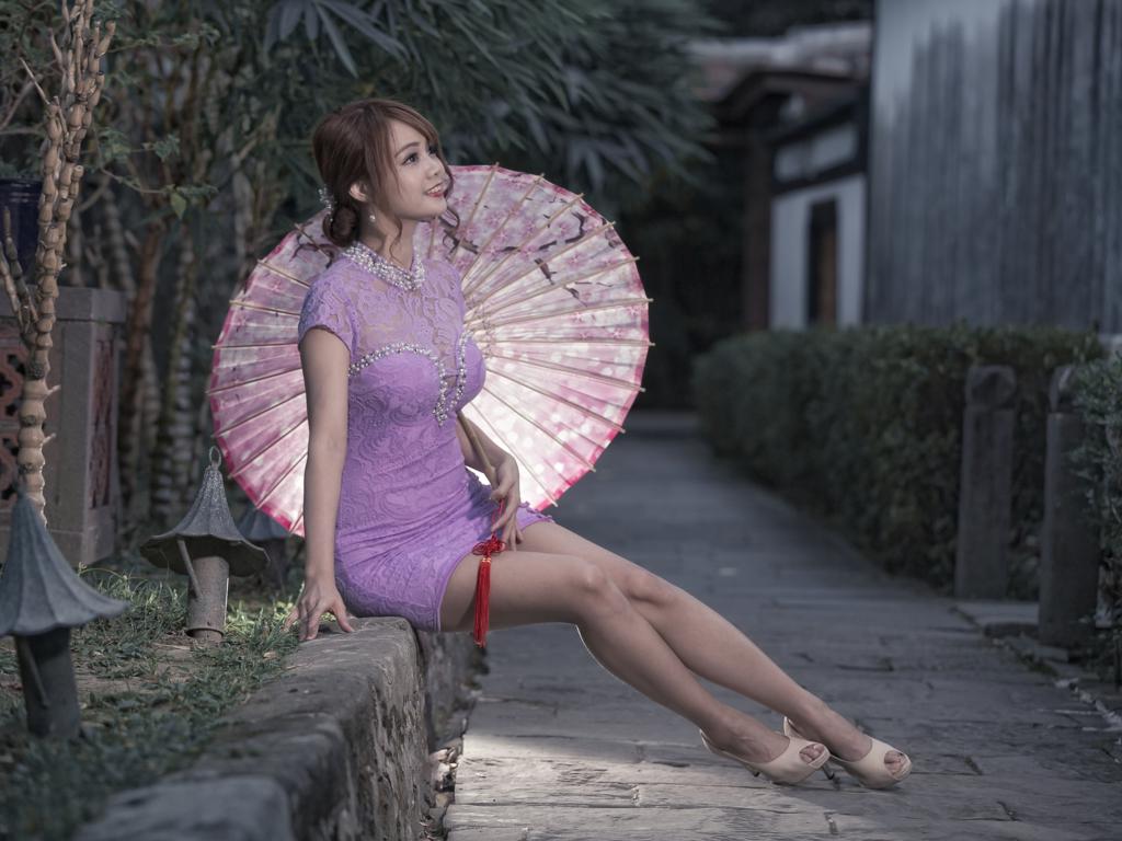 girl, asian, sweet, cute, sensual, umbrella, sexy legs, shoes, heels, pink dress