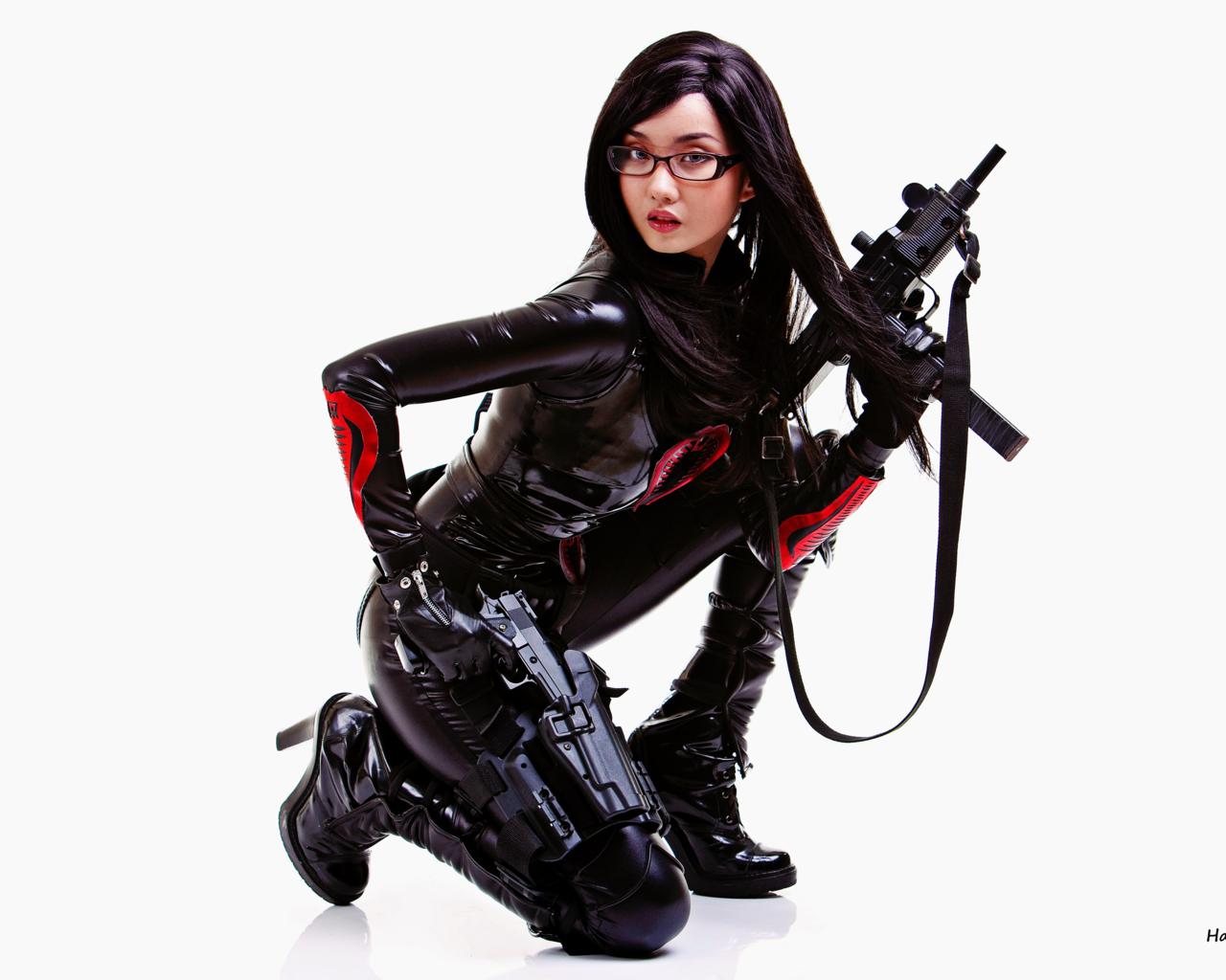 alodia, brunette, exotic, cosplayer, amateur, slim, asian, long hair, posing, kneeling, lycra, catsuit, pvc, knee boots, cosplay, the baroness, girls and guns, uzi, erotic, ultra, hi-q, best quality, minimalist wall, own cut, babes in boots