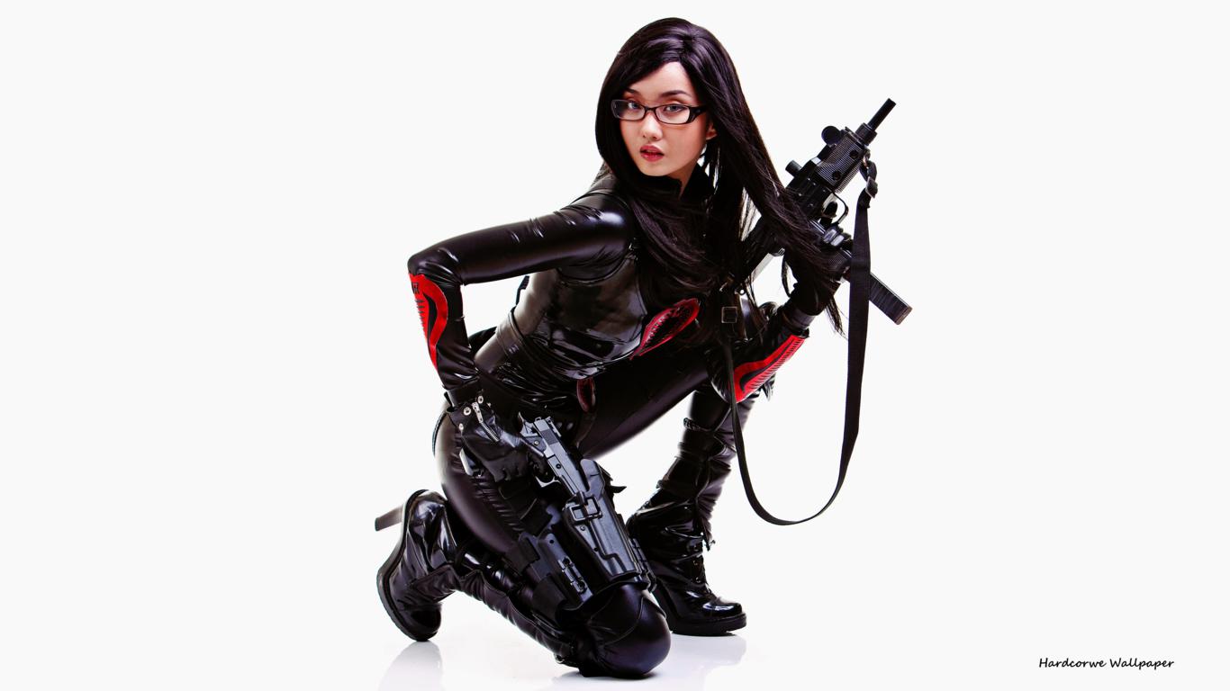 alodia, brunette, exotic, cosplayer, amateur, slim, asian, long hair, posing, kneeling, lycra, catsuit, pvc, knee boots, cosplay, the baroness, girls and guns, uzi, erotic, ultra, hi-q, best quality, minimalist wall, own cut, babes in boots