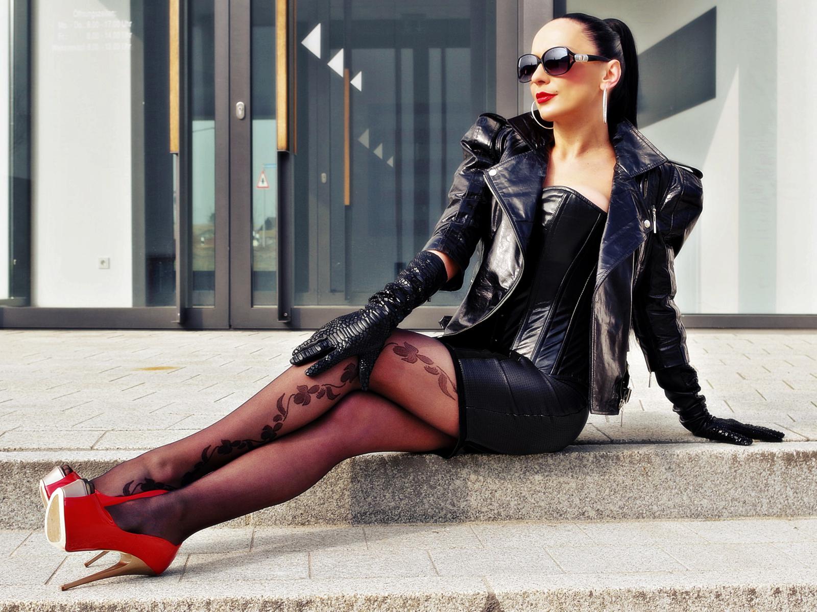 nadja, german, amateur, fetish model, brunette, milf, real life, mistress, domina, fetish diva nadja, posing, munich, allianz arena, tight clothes, shiny, corset, miniskirt, jacket, gloves, stockings, legs, high heels, fetish babe, sunglasses, shiny clothes, red lips