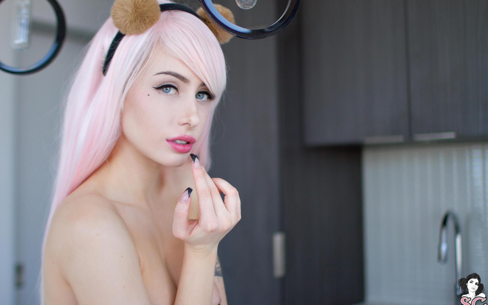 elie, pink hair, kitchen, piercing, black nails