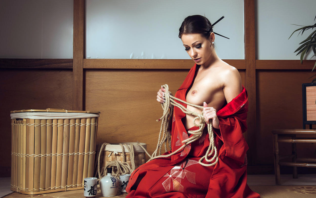 melisa mendiny, melisa a, lexa, brunette, robe, semi naked, tits, nipples, rope, hi-q
