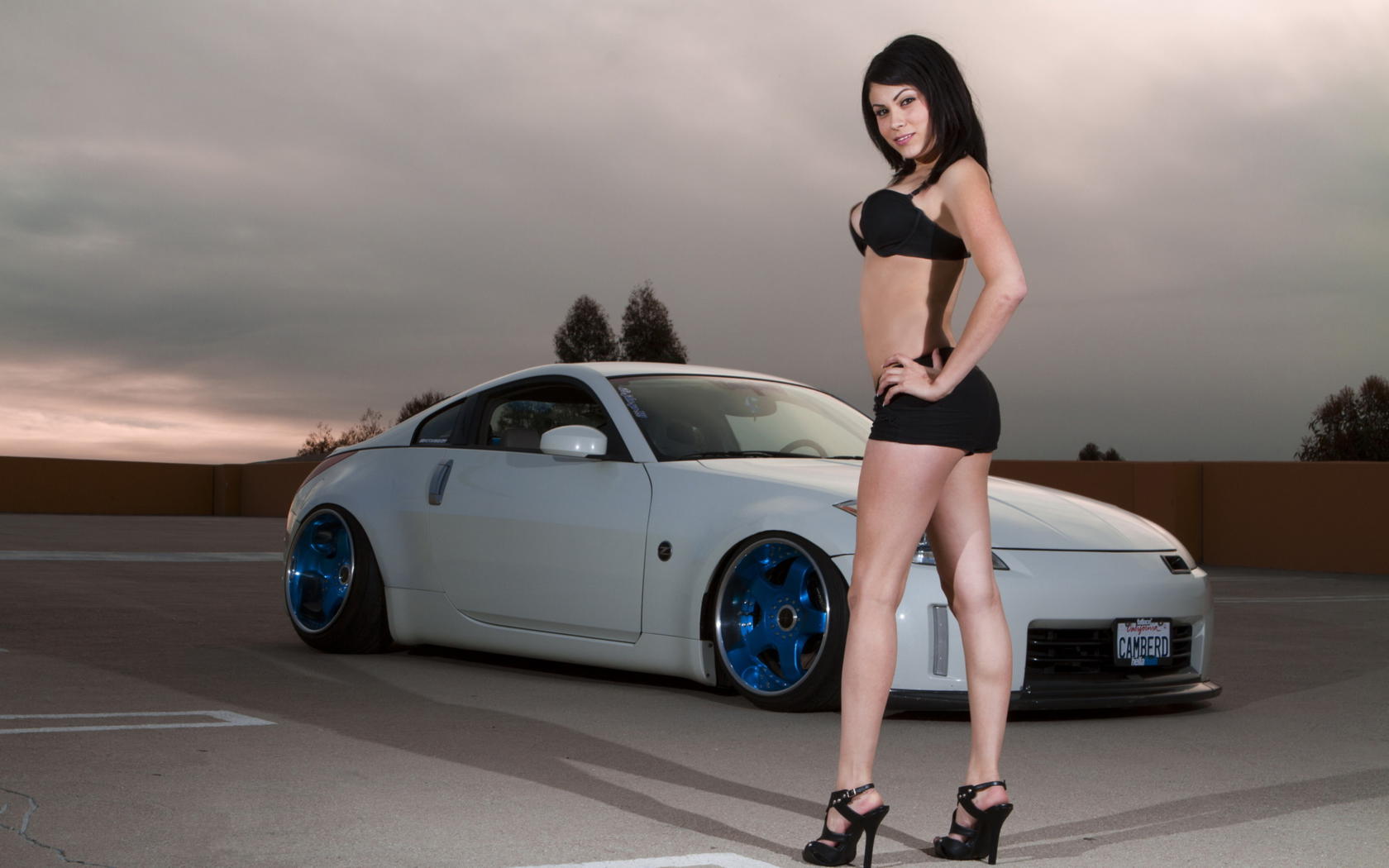 brunette, smile, lingerie, car