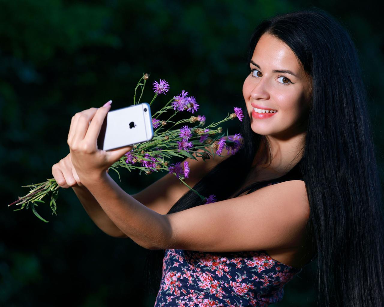 lola marron, malena r, brunette, sexy girl, adult model, smile, flowers, selfie