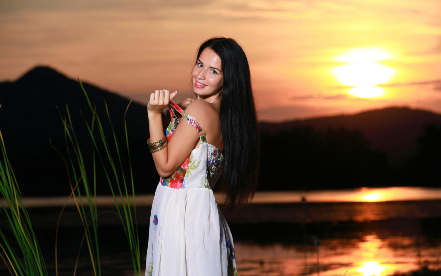 lola marron, malena r, brunette, sexy girl, adult model, sexy dressed, sunset, smile, beach, undressing