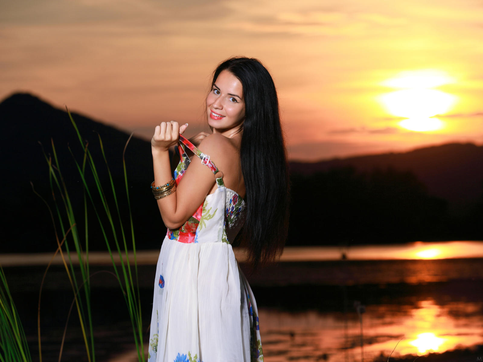 lola marron, malena r, brunette, sexy girl, adult model, sexy dressed, sunset, smile, beach, undressing