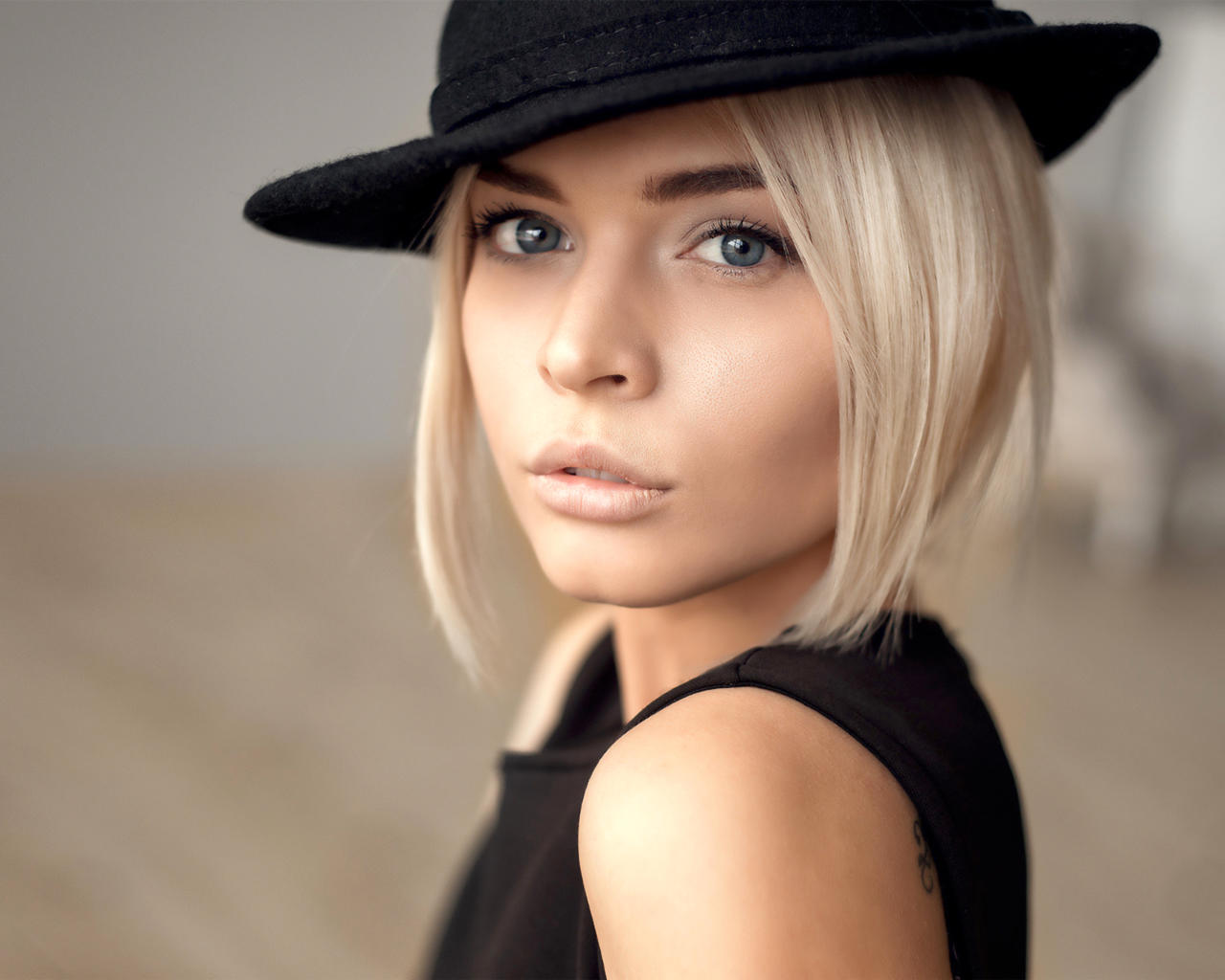 kristina mamatyukova, model, pretty, babe, blonde, russian, blue eyes, hat, sensual lips, beautiful, face, 4k, portrait