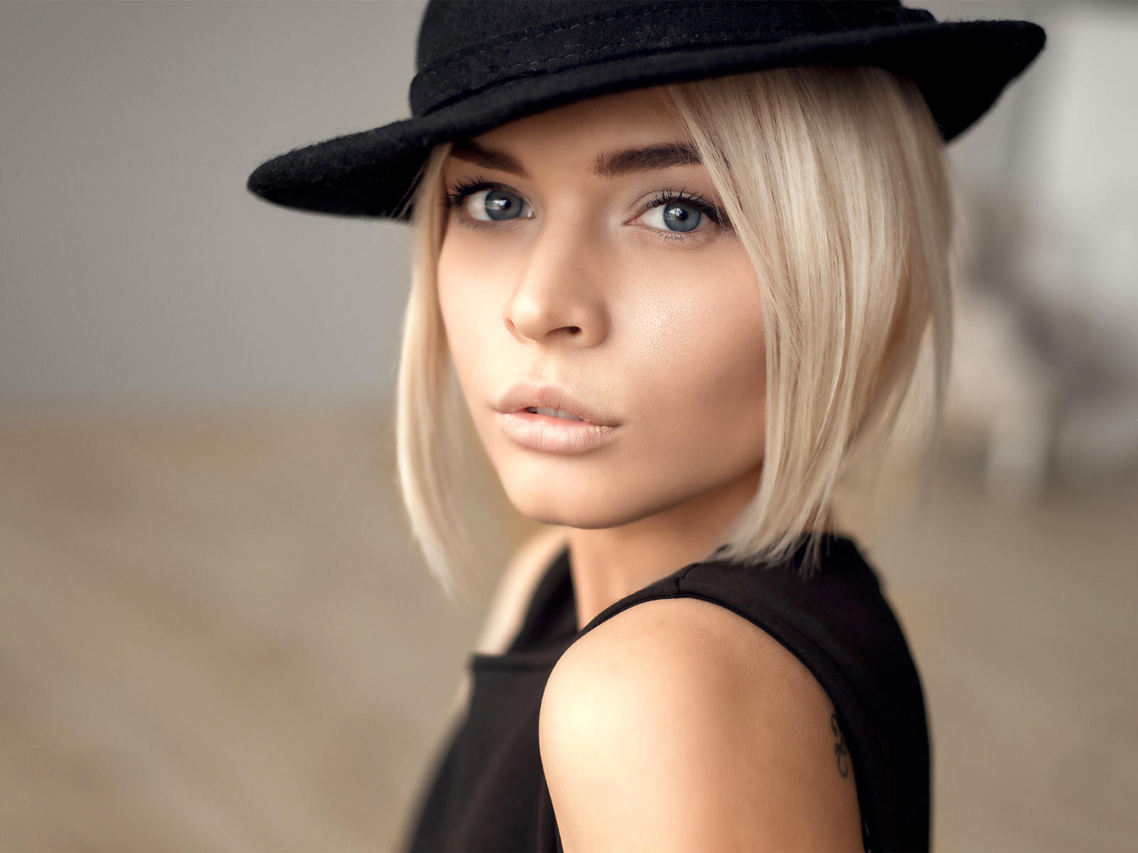 kristina mamatyukova, model, pretty, babe, blonde, russian, blue eyes, hat, sensual lips, beautiful, face, 4k, portrait