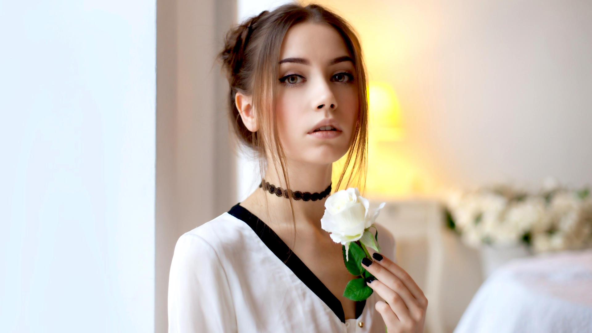 ksenia kokoreva, model, pretty, babe, brunette, russian, sensual lips, face, rose, 4k, white rose