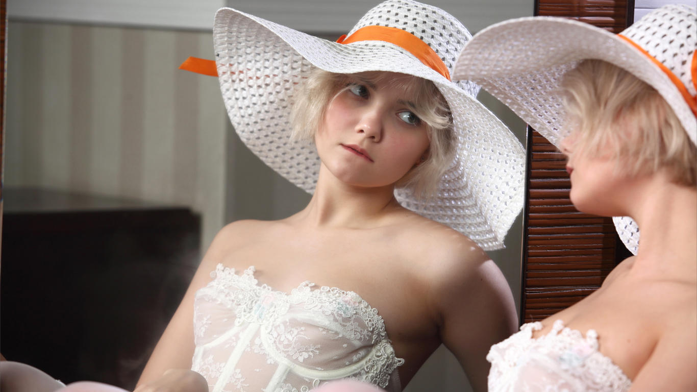 cali, sandra, blonde, model, hot, hi-q, young, sweet, cutie, eighteen, mirror, hat, tights, chanel fenn, reflection