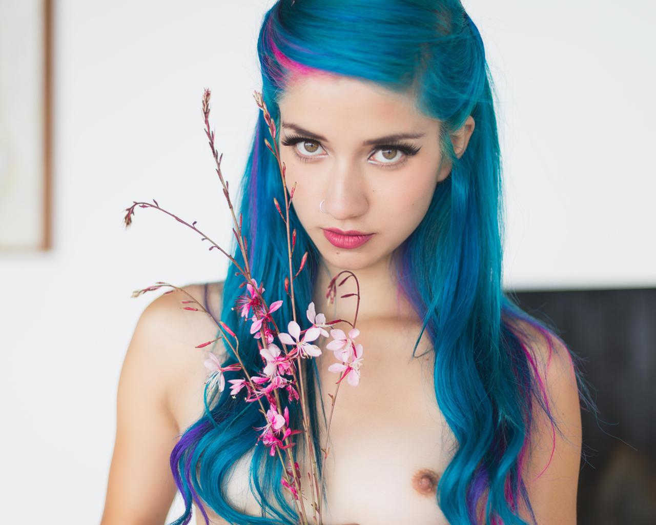 fay suicide, suicide girls, boobs, flowers, blue hair, tits, nipples