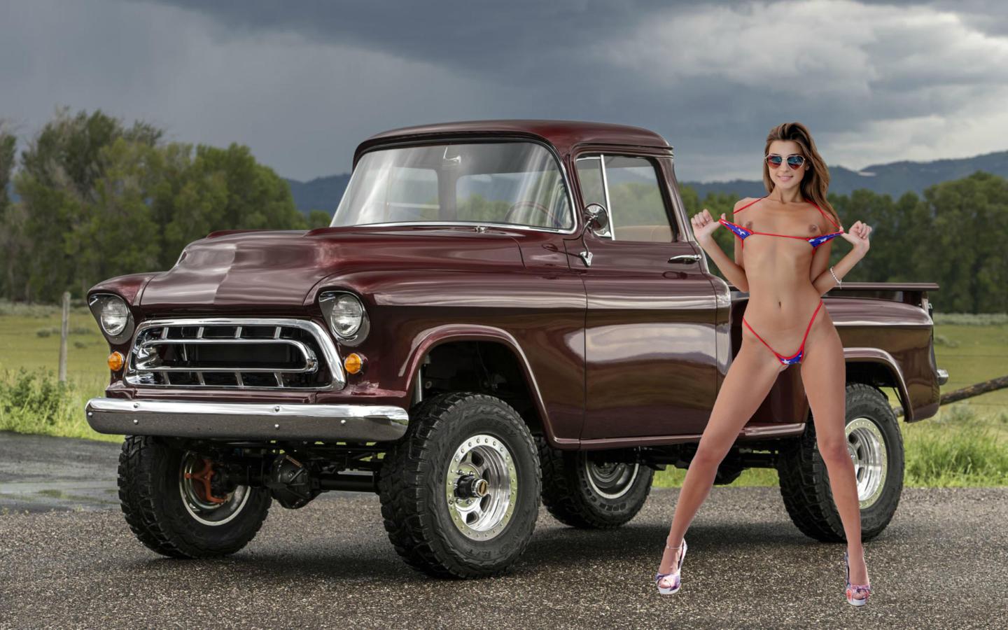 maria ryabushkina, maria, tara, melena, maria rya, brunette, outdoors, truck, 56 chevy, bikini, topless, tanned, boobs, tits, nipples, sunglasses, high heels, smile, spread legs, hi-q