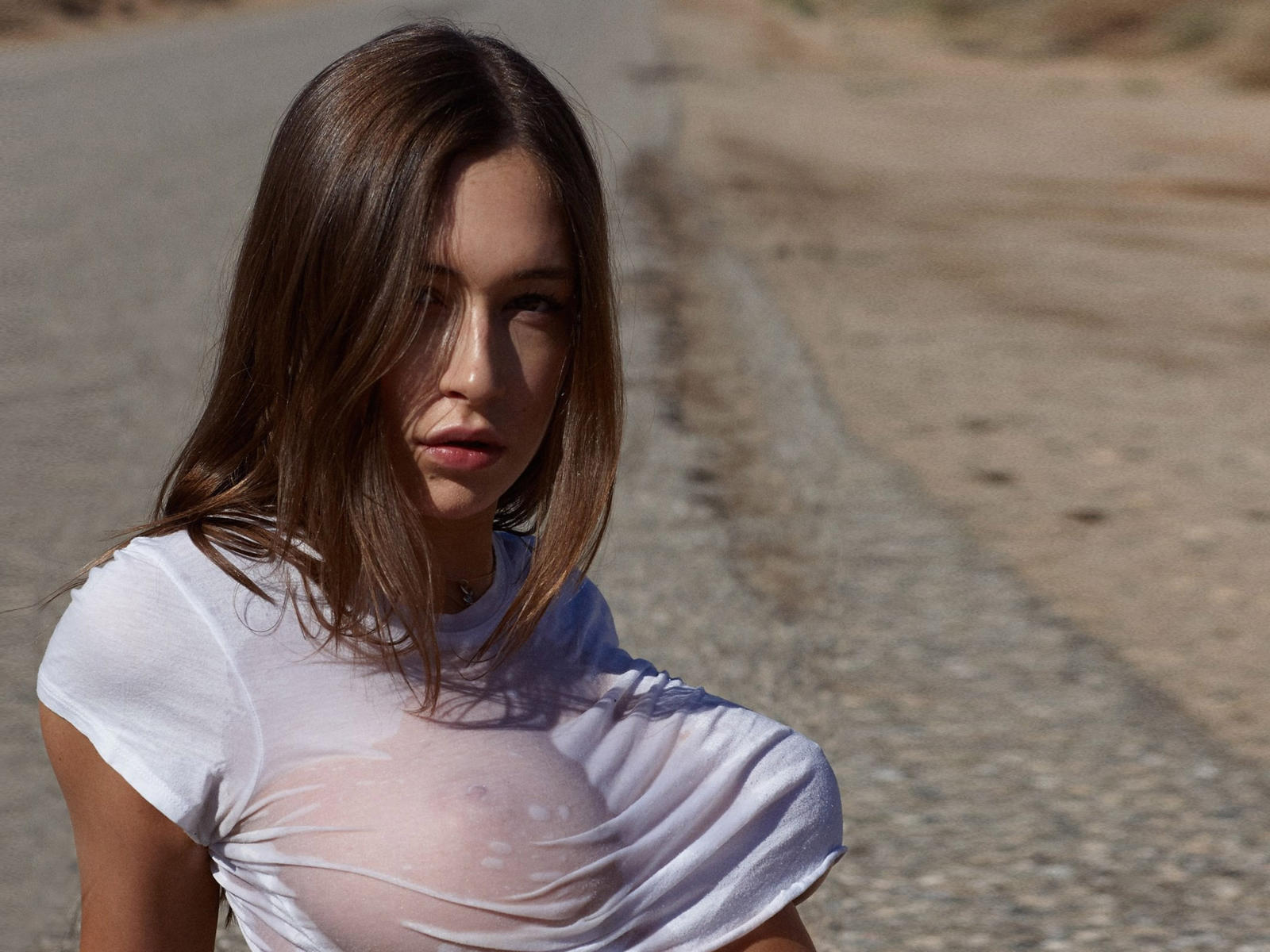 brunette, long hair, outdoor, wet, boobs, big tits, nipples, beach, sea, see through, sheer, wet tshirt