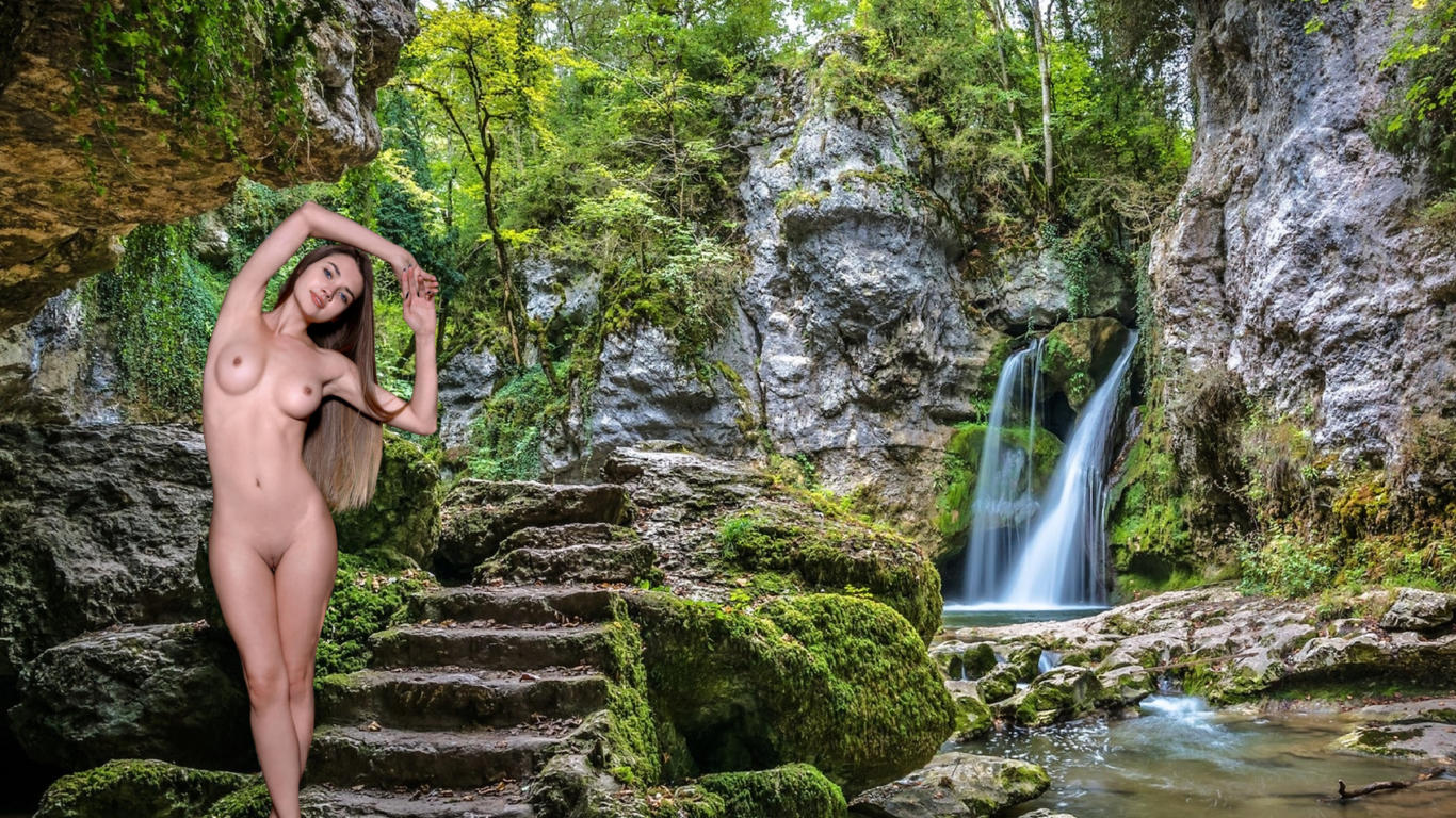georgia, viva, susza k, brunette, outdoors, waterfall, steps, naked, boobs, tits, nipples, shaved pussy, labia, smile, hi-q