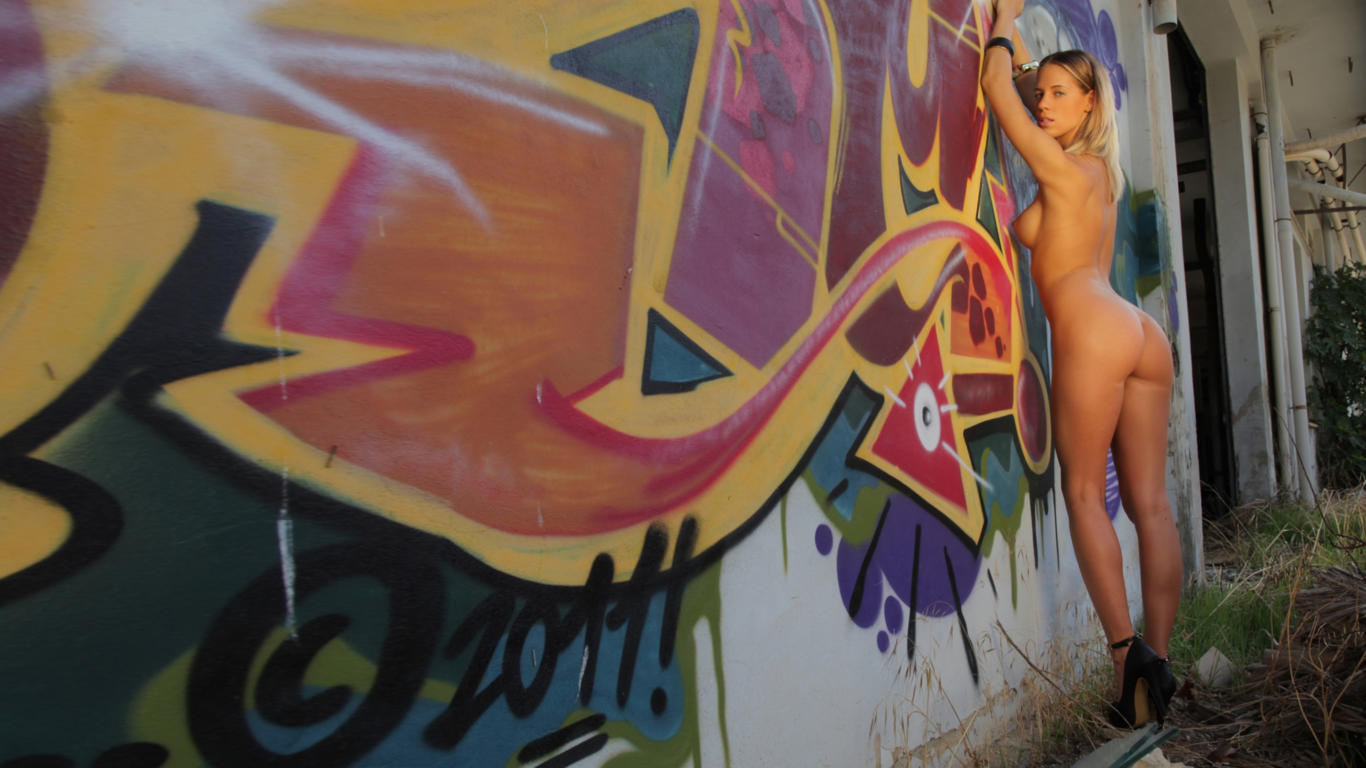 adele, boobs, blonde, model, nude, wall, ass, high heels, tits, tanned, oiled, graffiti