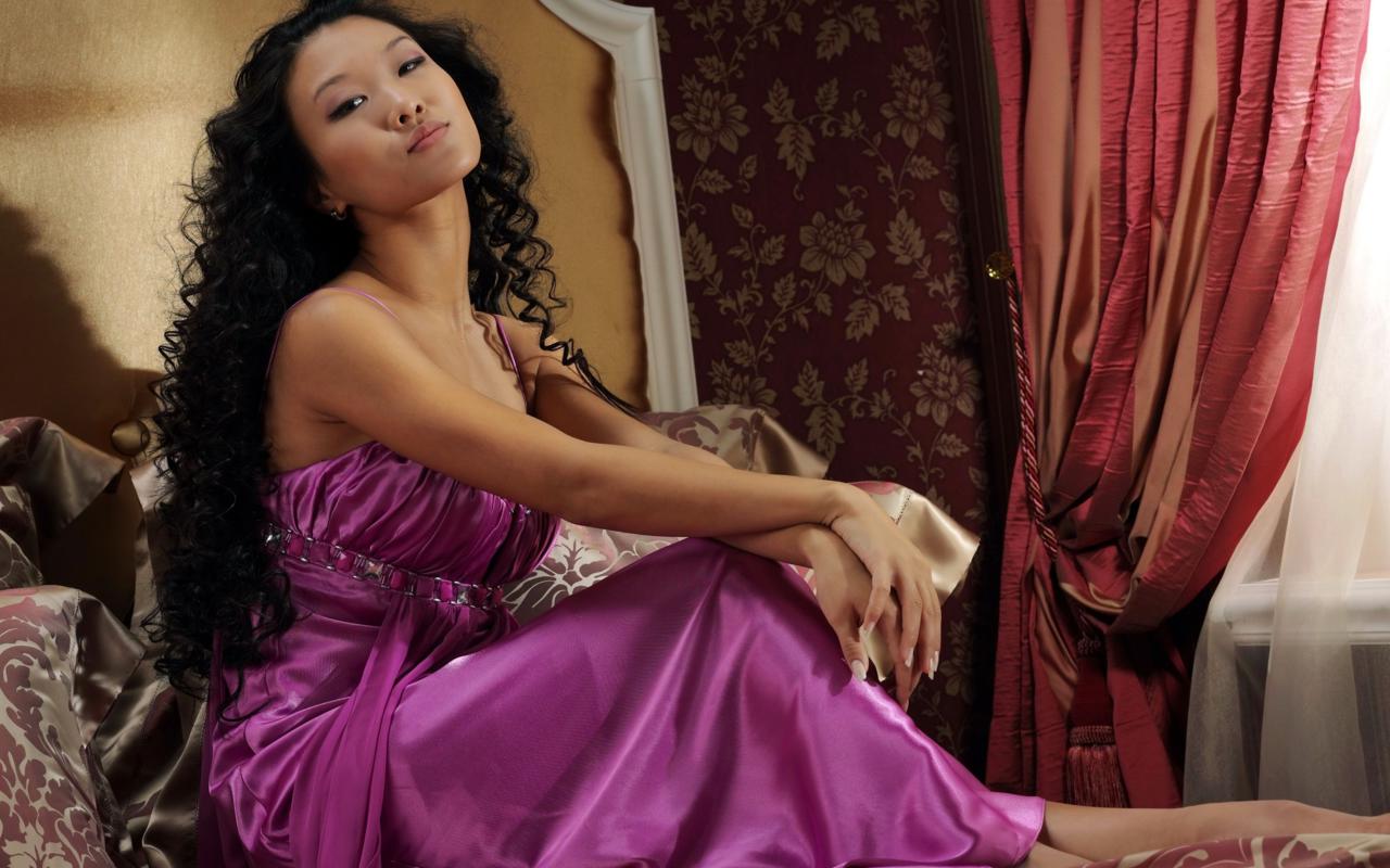 mariko o, sexy, girl, asian, brunette, dress, bed, long hair, black hair
