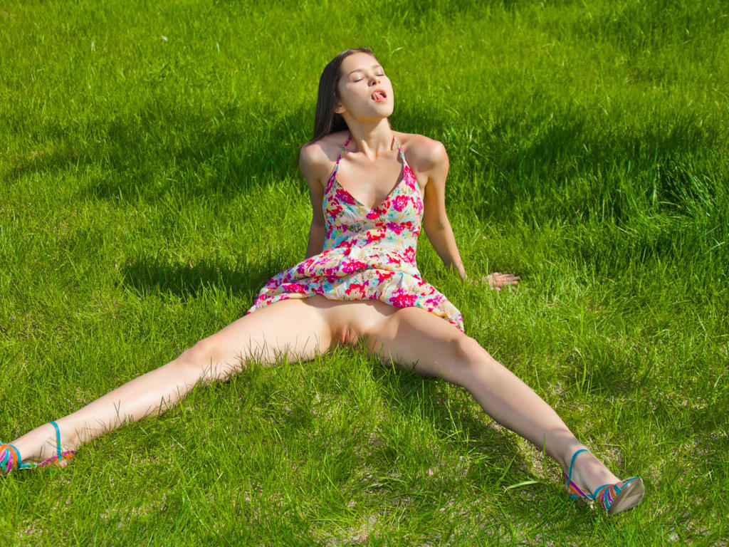 nastya k, dress, pussy, sexy, wquxga, grass, spreading, legs, heels, skinny, delicious, small tits, tiny tits, brunette, outdoors