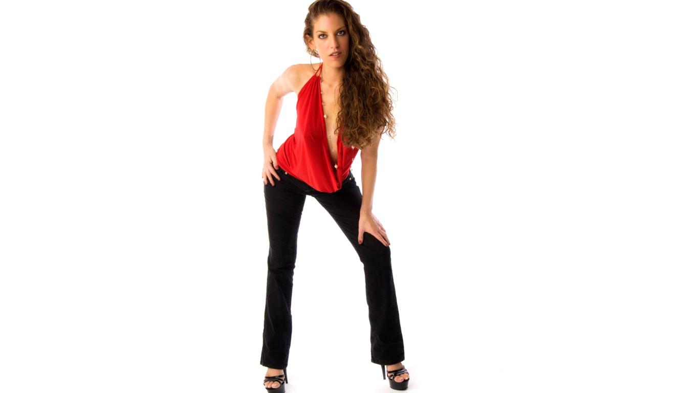 jen, cute, curly hair, smile, sexy babe, high heels, red, top, jeans, jeans, minimalist wall, hi-q