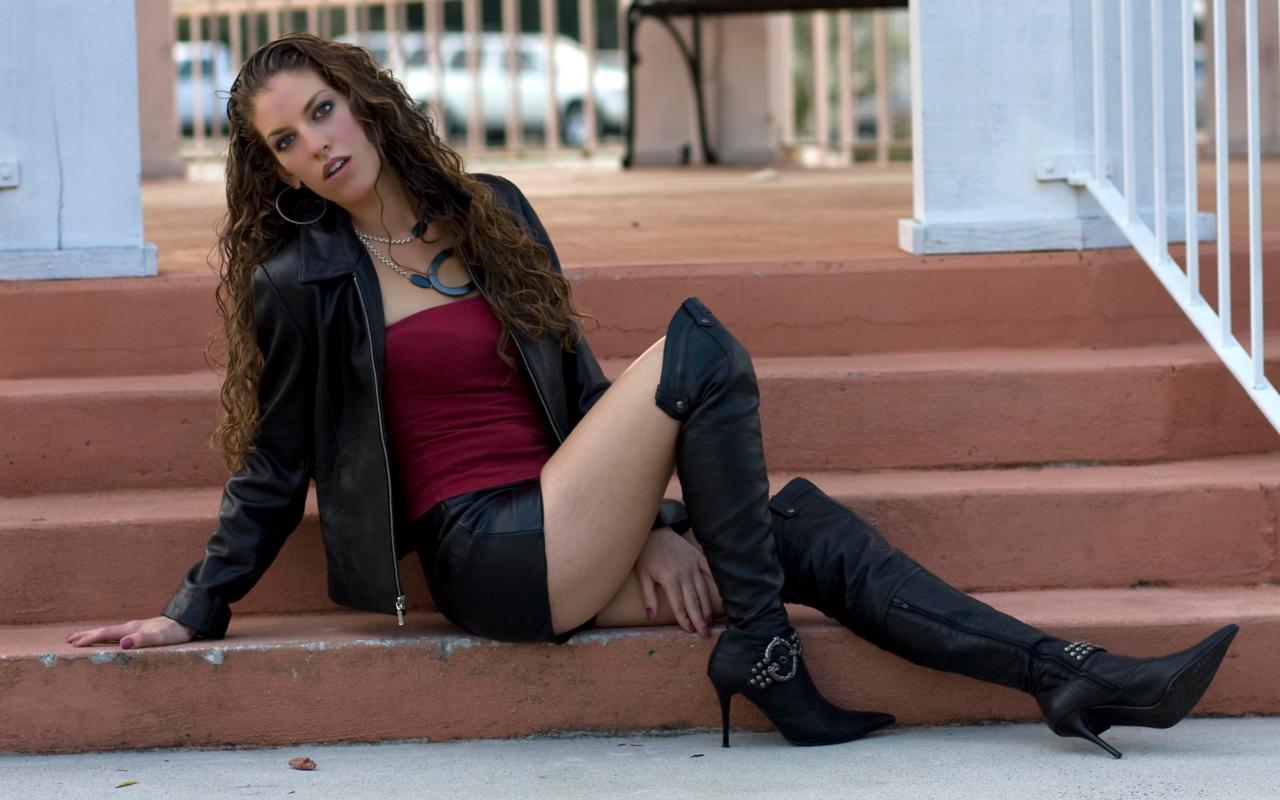 jen, cute, curly hair, smile, sexy babe, leather, high boots, fetish babe