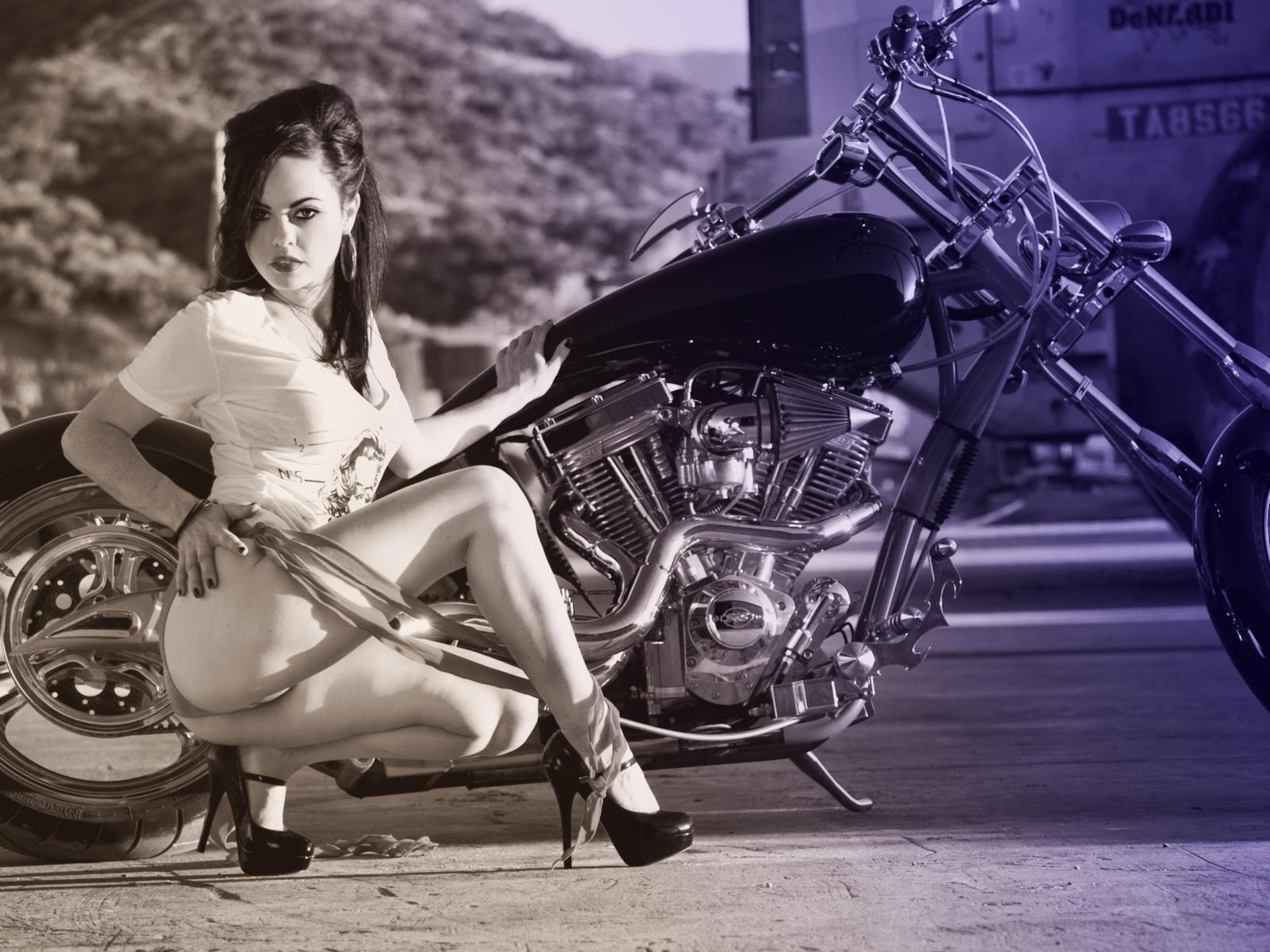 babydoll, sexy babe, costum bike, high heels, bike, brunette, long hair, posing, kneeling, sexy, dressed, flashing, cameltoe, photoshopped, pin up style, erotic, black and white, b&w