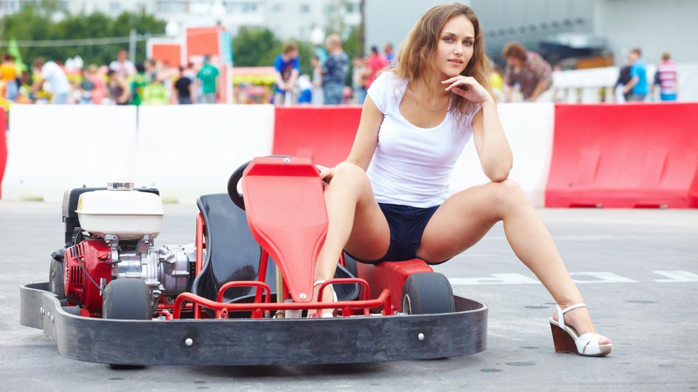 zlatka a, brunette, sexy girl, t-shirt, shorts, beautiful female legs, thighs, sandals, legs, spreading, heels, go kart, brownette, kart, thighs, beauty